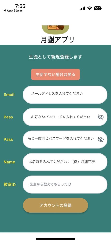 お名前: 「お名前を入れてください:(例)月謝花子」