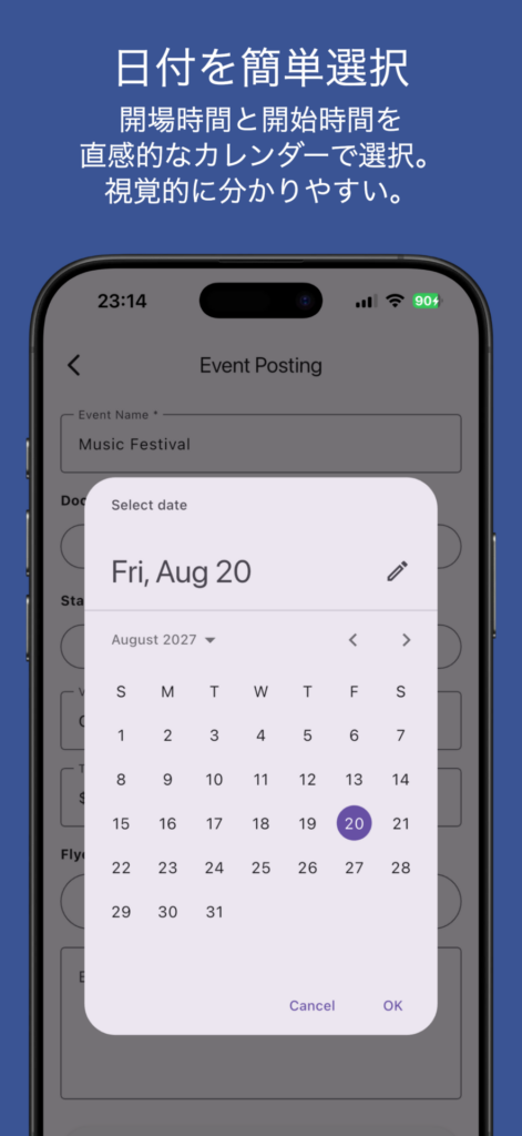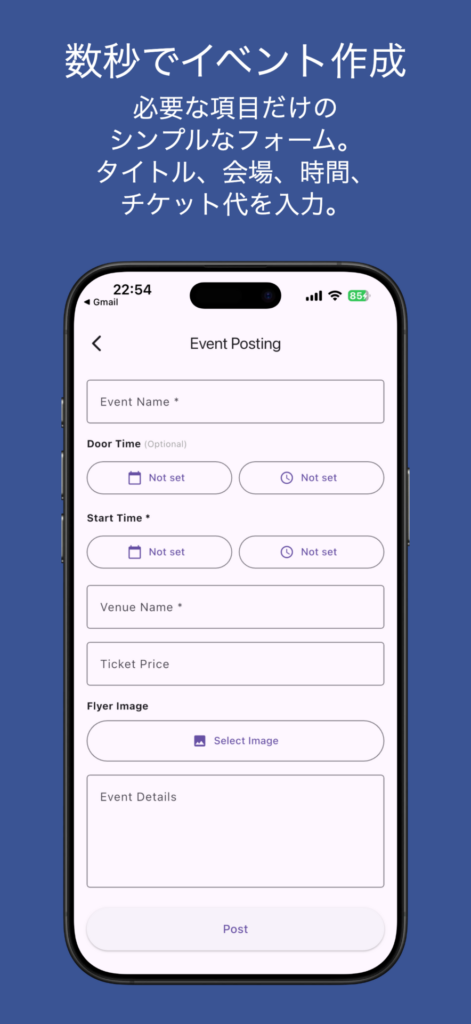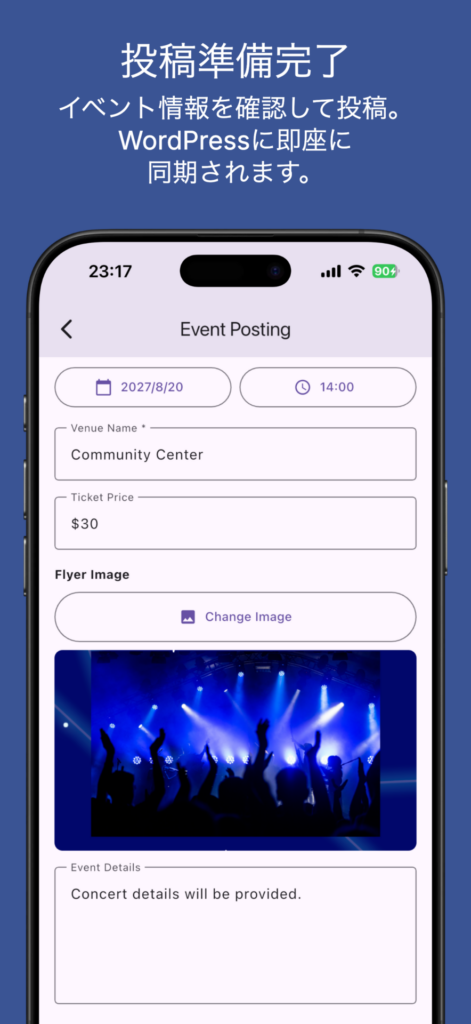 - サイトへのイベントタイトル、開場時間、開始時間、会場、料金、詳細情報が投稿可能