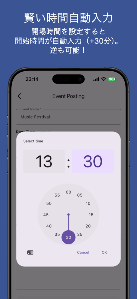 - イベント開場時間←→開始時間 どちらから入力でも自動入力(デフォルト30分違い)