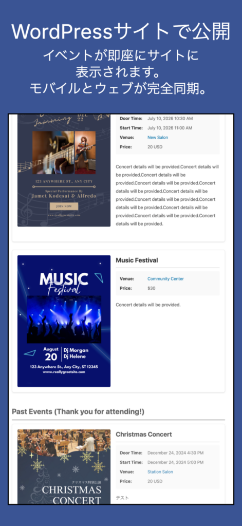 演奏者やイベント・セミナー主催者向けのコンサート&イベント情報管理プラグインです。