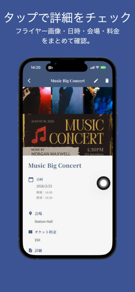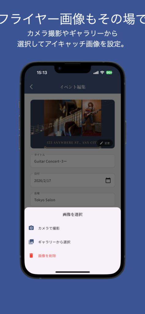 - 画像アップロード — カメラ撮影またはギャラリーから選択してフライヤー画像を設定