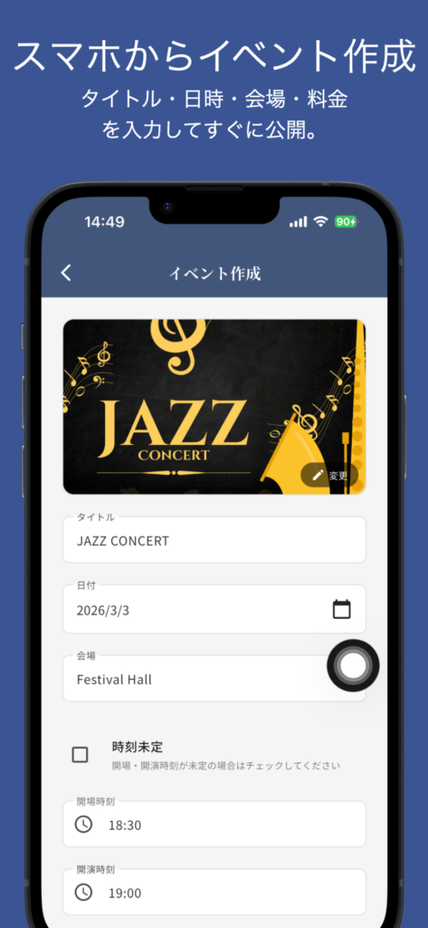 - イベント作成 — タイトル、日時、会場、チケット料金を入力して即公開