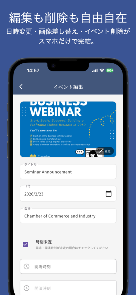 - イベント編集 — 日時変更、画像差し替え、内容修正がスマホだけで完結