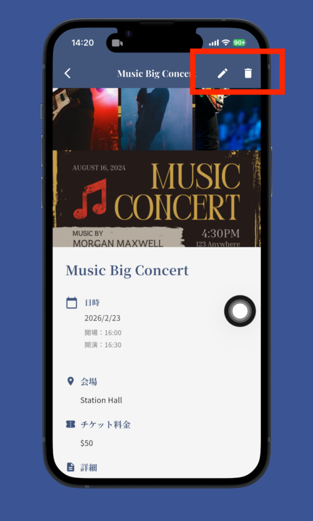 自分が投稿したイベントの詳細画面をクリックで