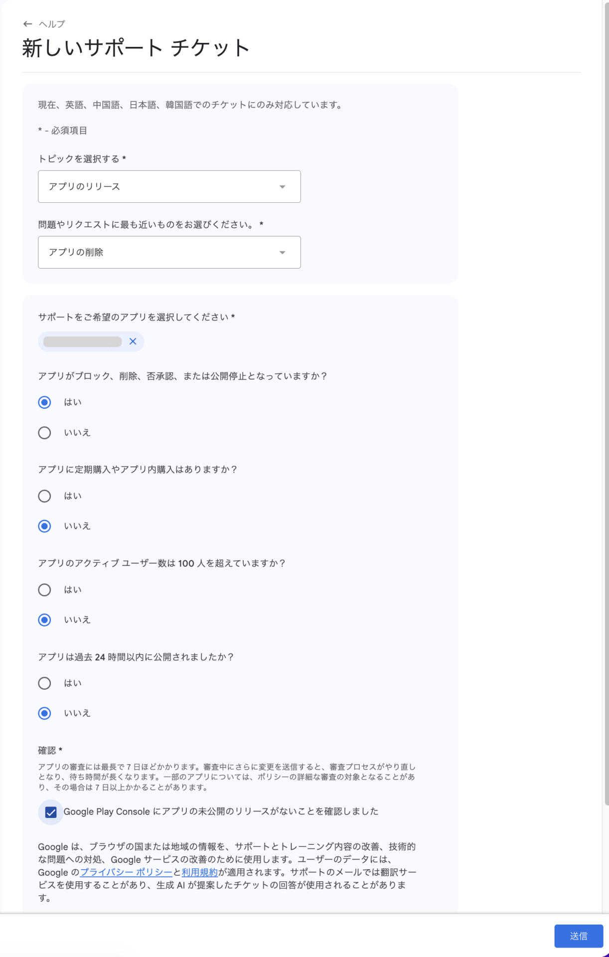 アプリが「公開停止中」で、直近30日間に1回以上起動したアクティブデバイスが100台未満なら、コンソール上から自分で削除可能です。