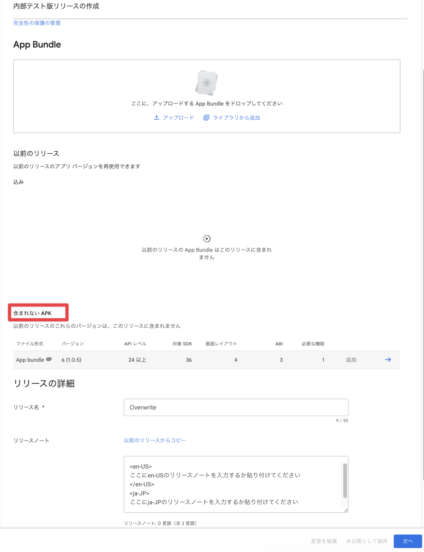 ・「含まれない APK」に現在公開中の APK/Android App Bundle が設定されていることを確認