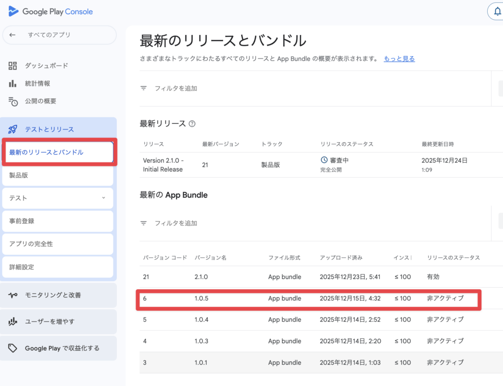 「テストとリリース」>「最新のリリースとバンドル」を確認すると