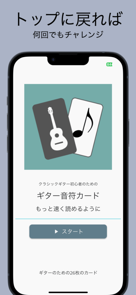 ギターの楽譜で必要な音符は主に26個だけ。それを最短で覚えるためのアプリです