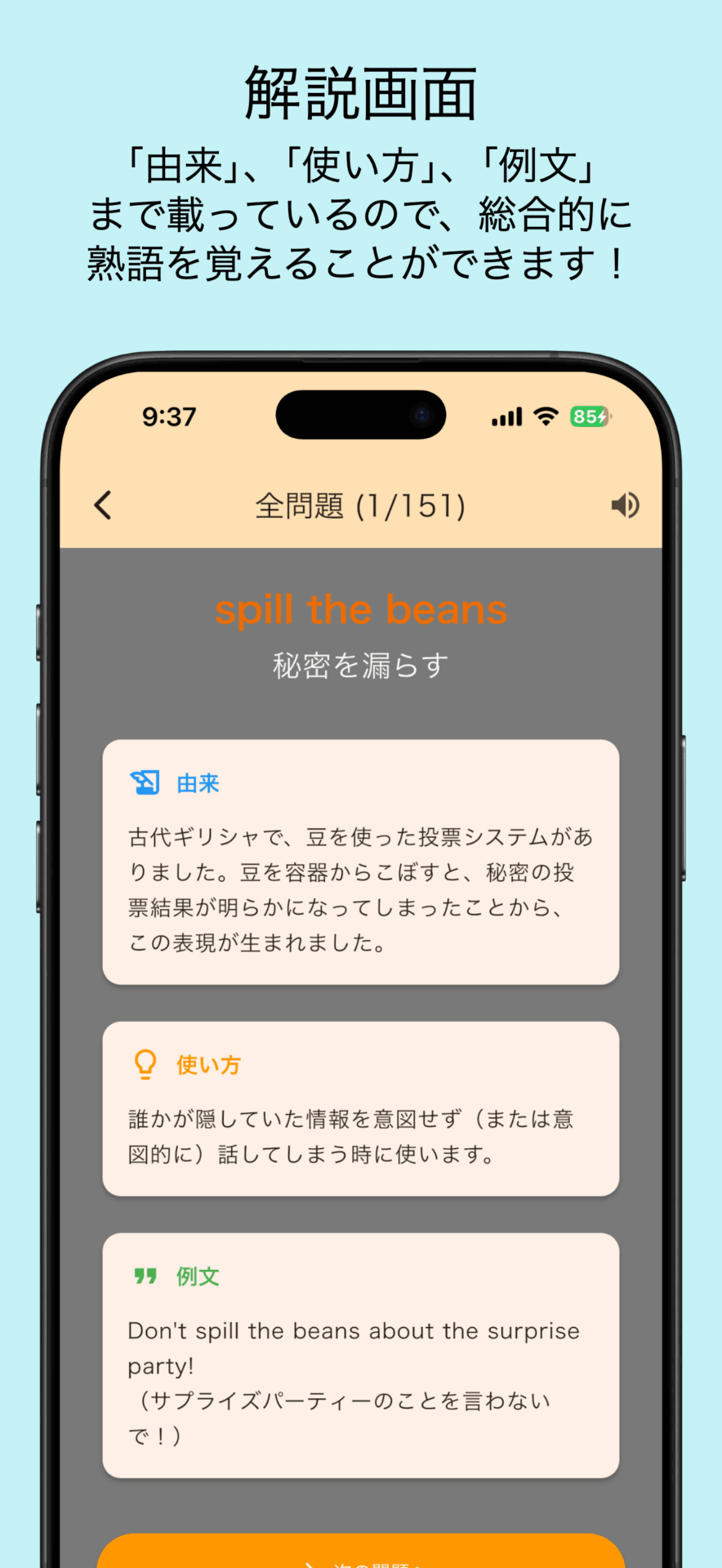 現在151個の英熟語を収録。日常会話やビジネスシーンで使える実用的な表現を厳選しています。今後のバージョンアップでさらに熟語を追加予定です。