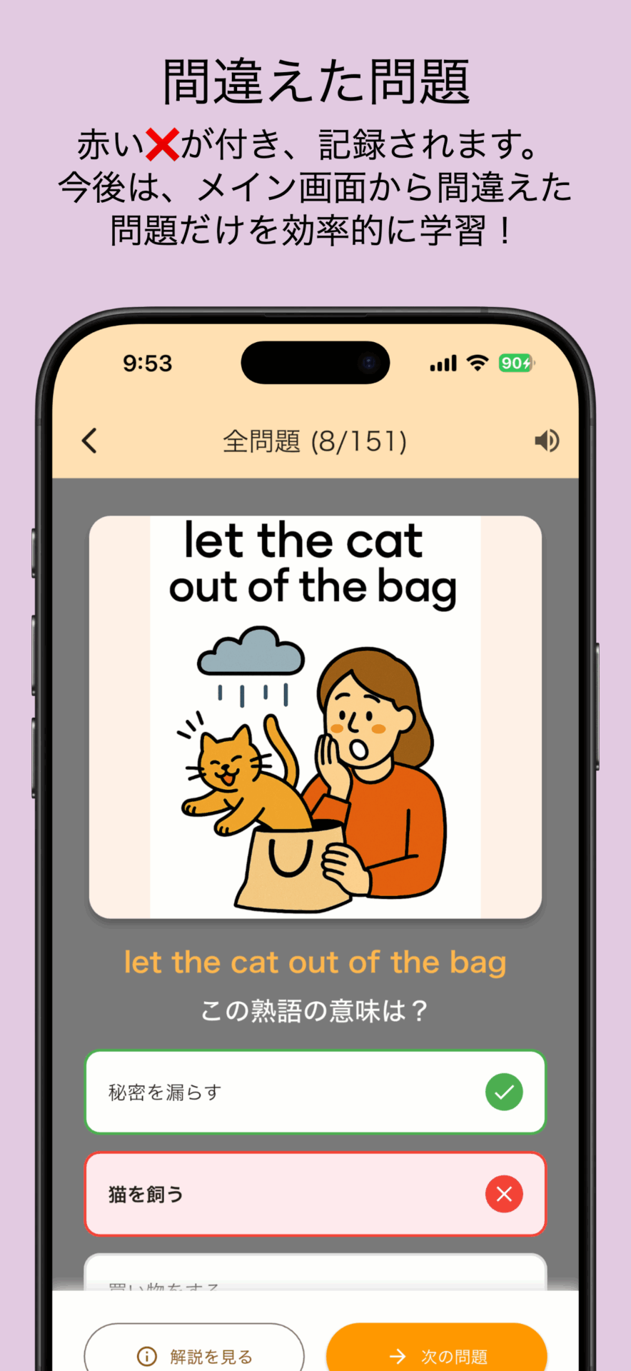 クイズ形式で熟語の意味を学べます。間違えた問題は自動的に記録され、復習に役立ちます。