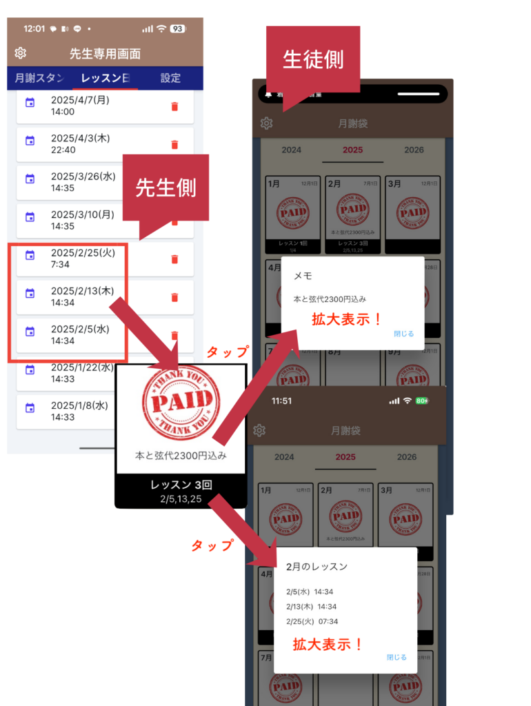 - スタンプ登録:月謝を受け取ったら生徒を選んでスタンプ。受領日が自動入力され、メモも一緒に記録できます。