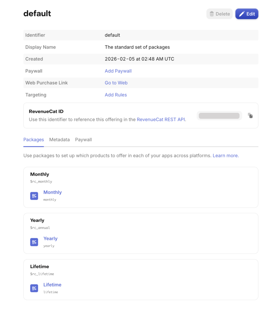 3つのパッケージ(RevenueCat側でパッケージの「枠」が作成された。中身ではなく箱)