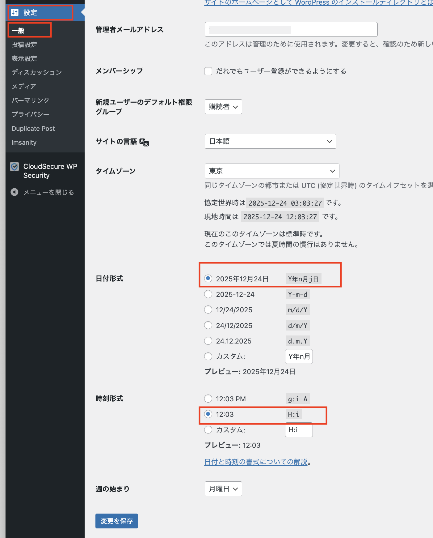 ダッシュボード「設定」→「一般」→「日付形式」と「時刻形式」