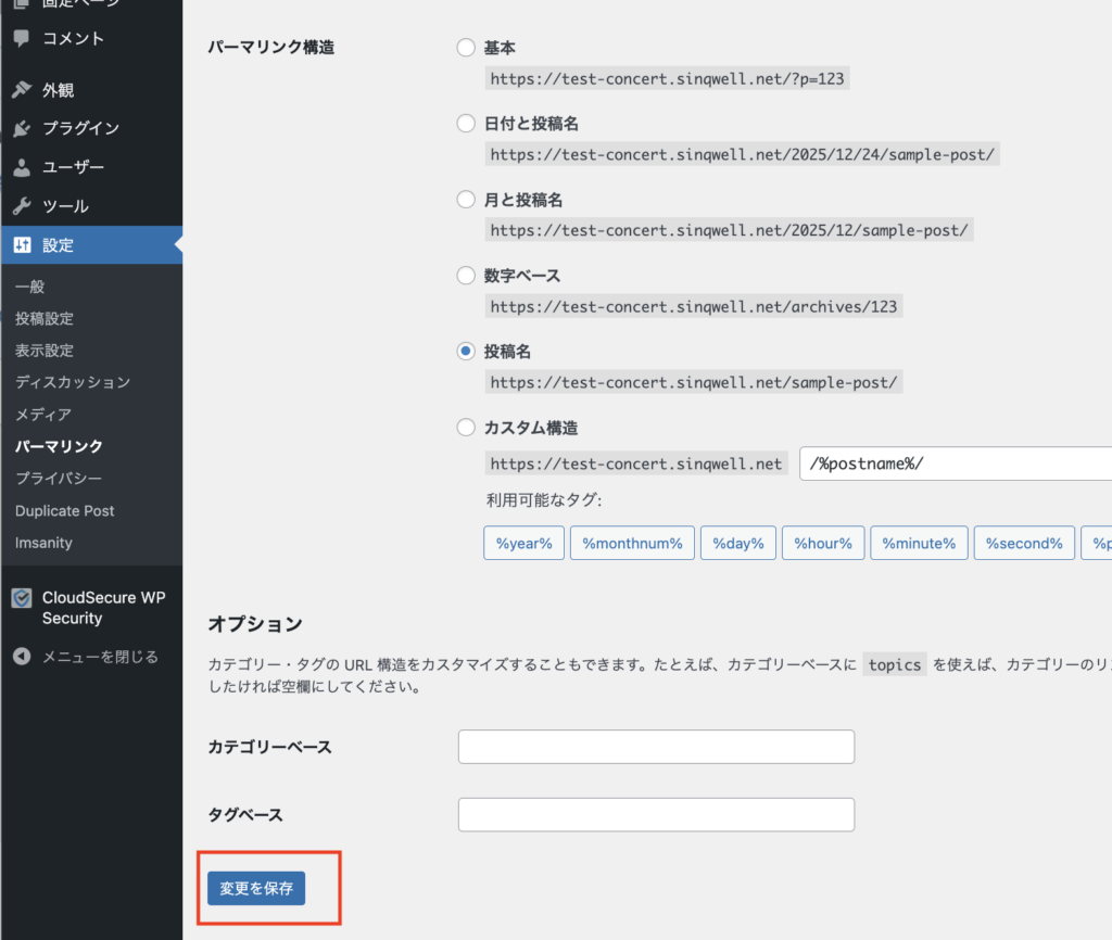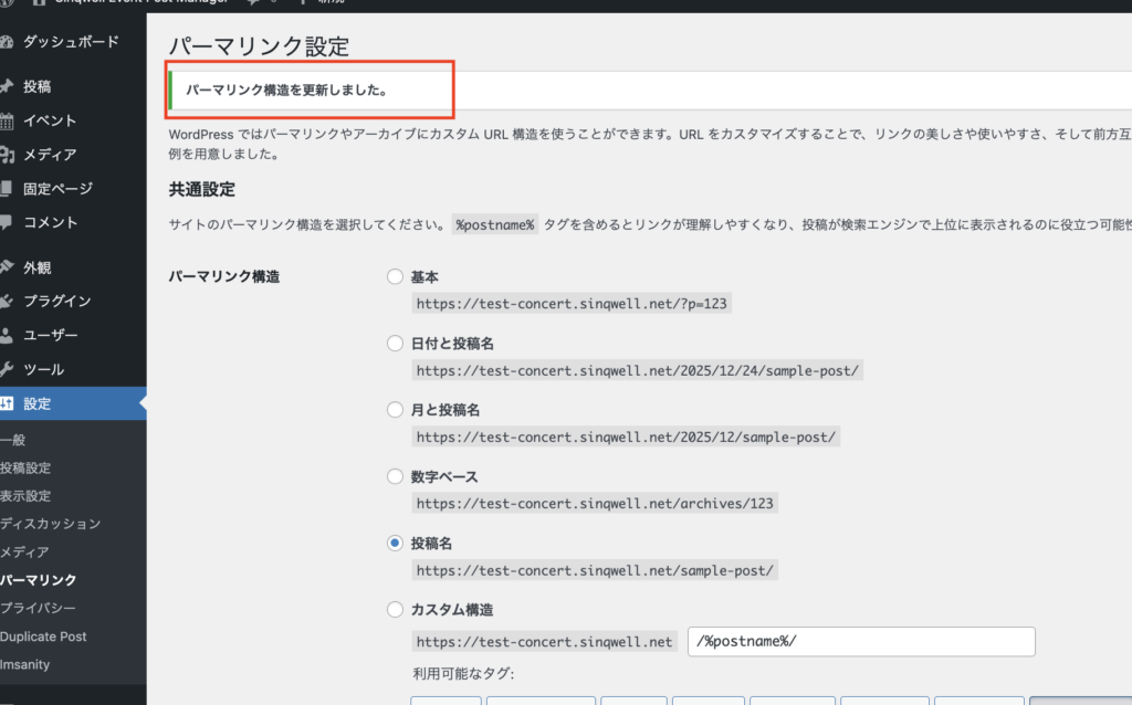 「パーマリンク構造を更新しました」とい表示がでます。